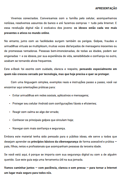 Adquira agora o e-Book 2, Cibersegurança para Idosos, mas com benefícios para todas as idades. Presenteie quem você ama e se preocupa, dê a ele esta ferramenta para conferir segurança nas suas interações na Internet.